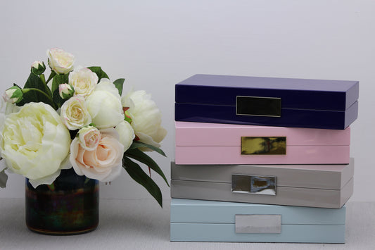 Our beautiful lacquered jewellery boxes feature a silver plated clasp and matching hinges.