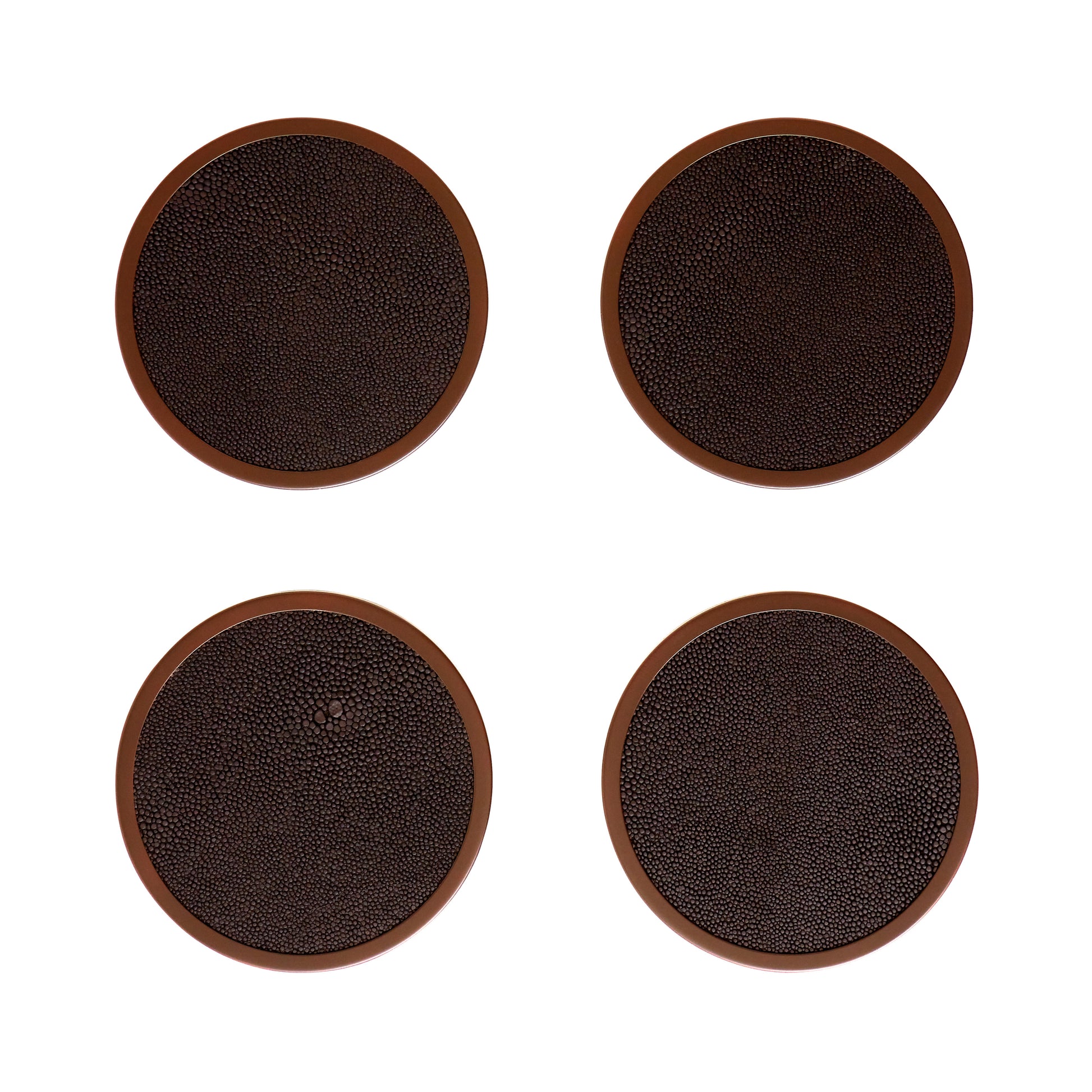 A set of 4 exquisite anthracite grey shagreen coasters, elegantly edged in bronze coloured metal trim. The base of each mat is covered with luxurious velvet to avoid scratching surfaces. Clean gently with a soft damp cloth and avoid cleaning sprays or abrasive materials on the metal trim. Comes beautifully gift boxed. Suitable for warm cups. 10cm diameter