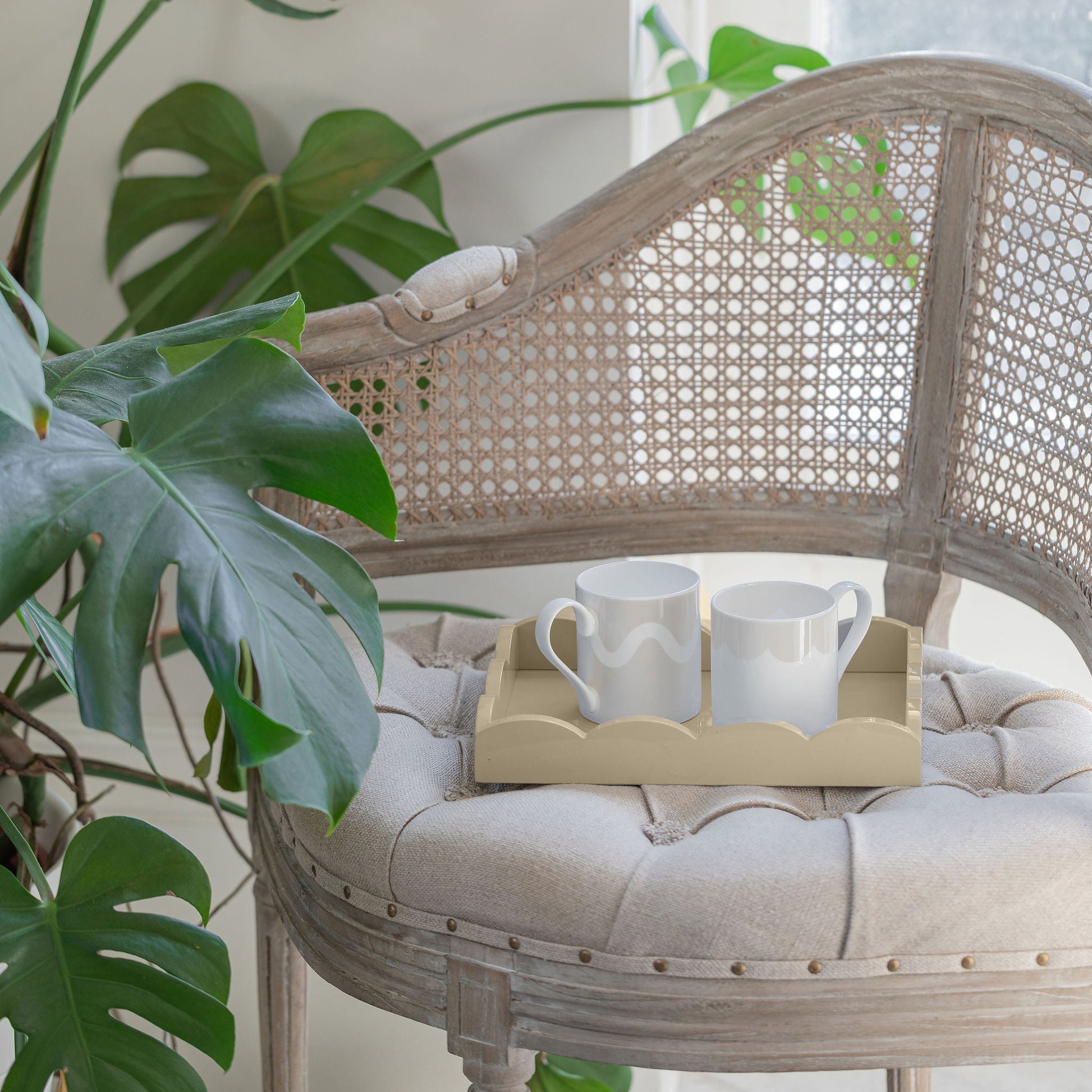 Our very pretty Chiffon Grey Small Scallop Tray is finished with 20 coats of high gloss lacquer, hand polished between each coat, this lovely tray is perfect as a small tea for two tray (or of course glass of wine for two!) or alternatively it is a perfect display tray for bathroom, bedside, kitchen or desk.