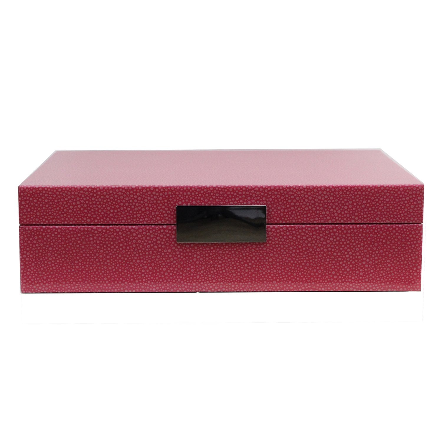 This stunning high gloss Pink Shagreen Box measures approximately 8 x 10.75 inches and features a silver plated clasp with matching hinges. All of our boxes have had 20 coats of lustrous polished lacquer.