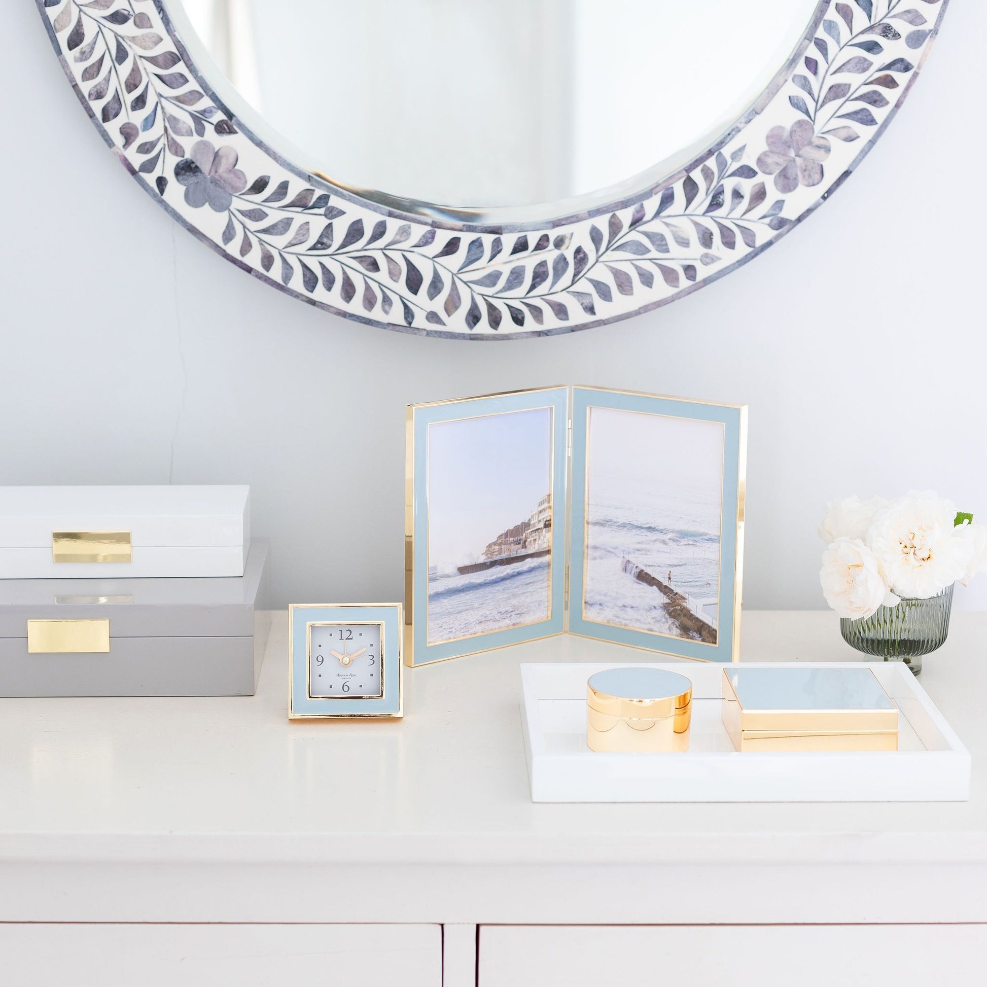 This incredibly pretty little turquoise enamel trinket pot is lined in soft stone coloured velvet. Finished with gold, with a fully removable lid, it is suitable to store jewellery, bedside or desk top bits and pieces.
