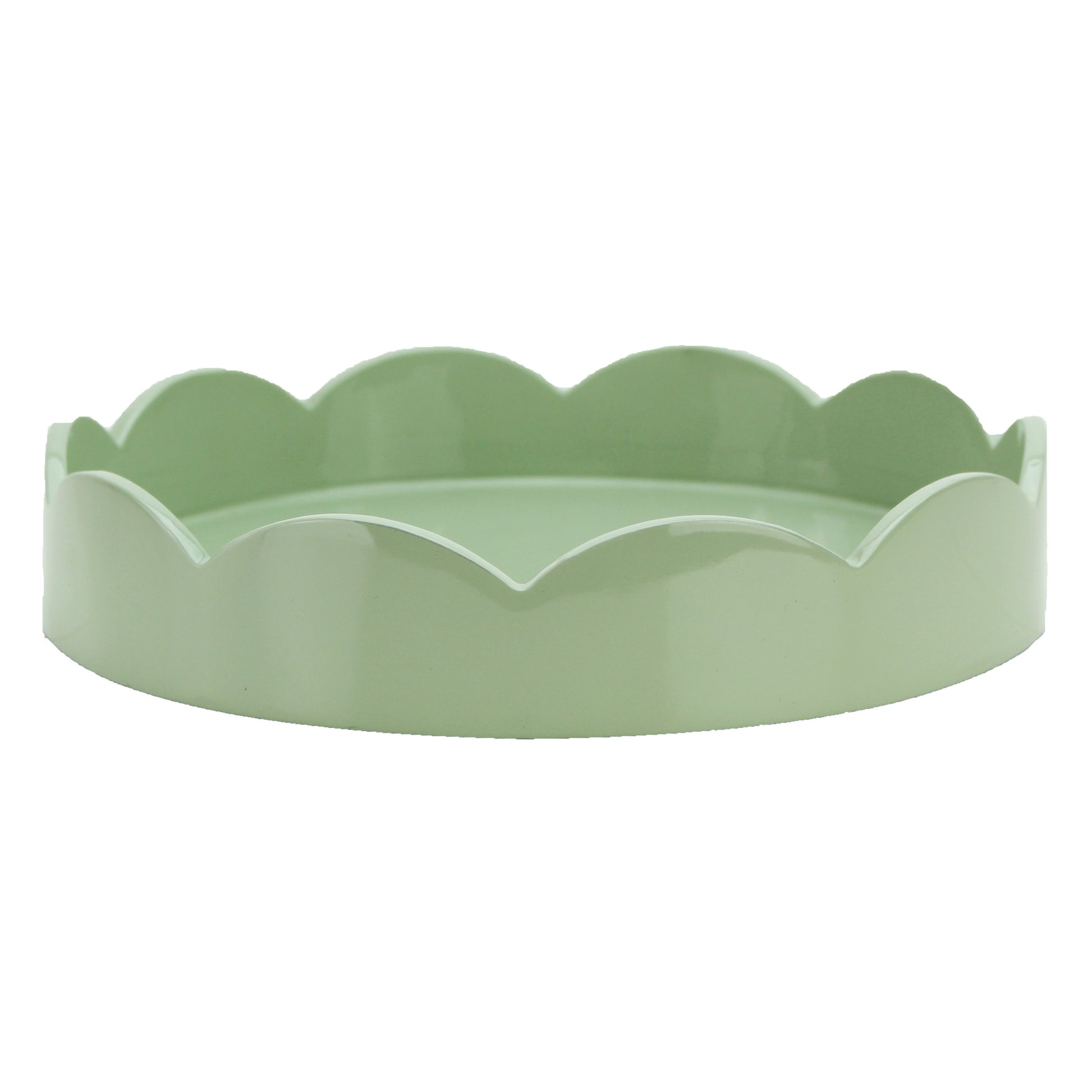 A pretty sage green round scallop small tray finished in 20 coats of high gloss lacquer, hand polished between each coat. The base is painted black satin and embossed with our logo.