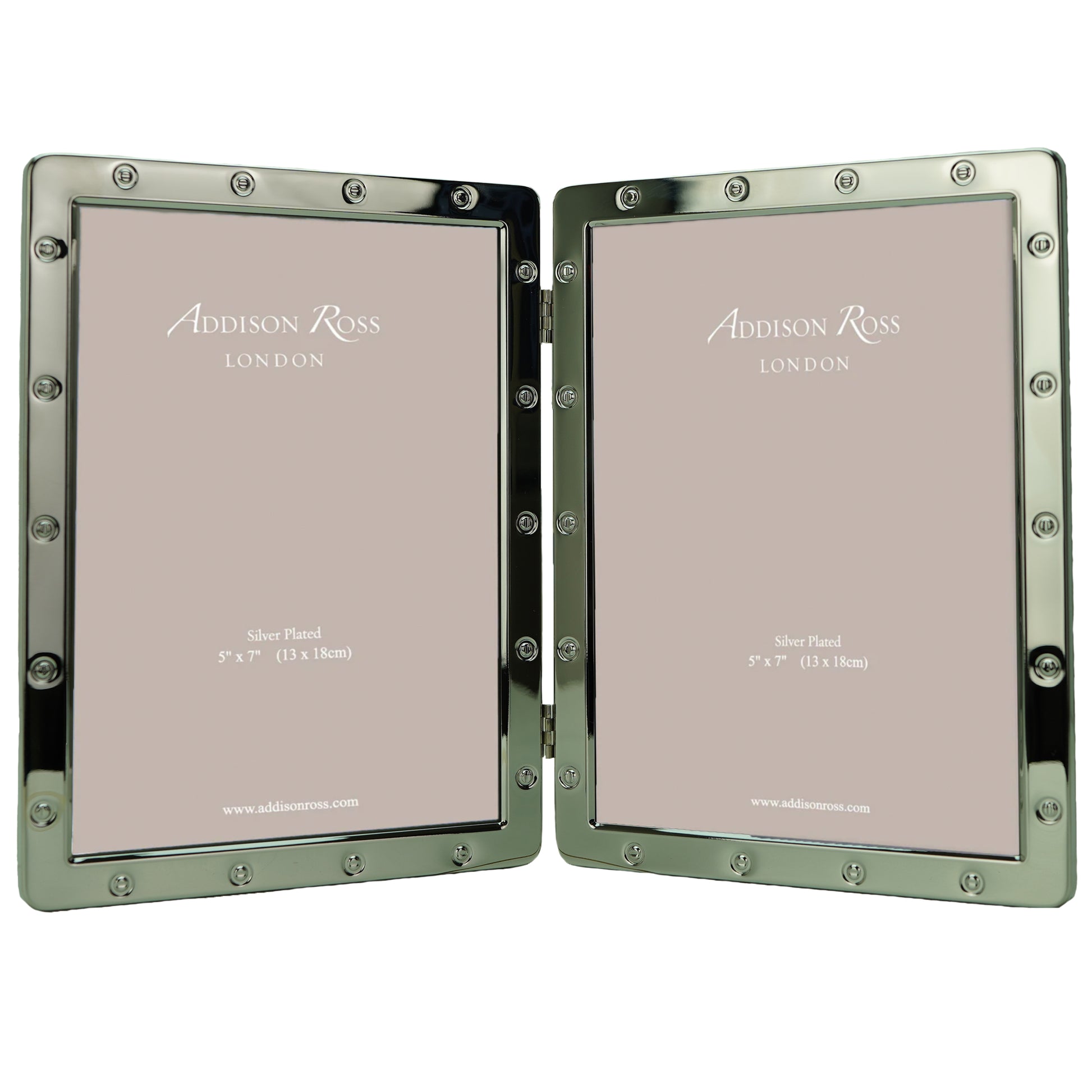 A beautiful gold plated double frame with screw detail, curved corners and a beautiful dove grey velvet backstand. Able to stand portrait only and beautifully gift boxed. Suitable to fit an 5x7 inch photo. Wipe clean with a soft cloth, do not use cleaning products on this item. Keep out of direct sunlight.